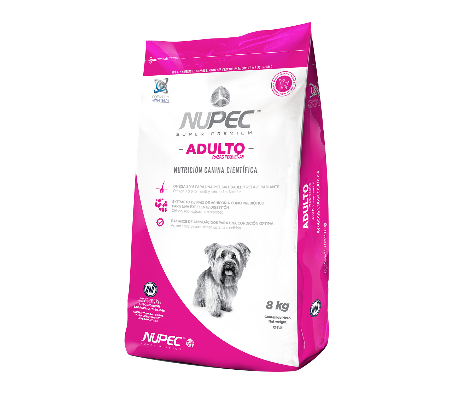 Los adultos de raza pequeña tienen boca y dientes más pequeños y menor capacidad del tracto intestinal, por lo que necesita una croqueta pequeña como la de NUPEC Adulto RP