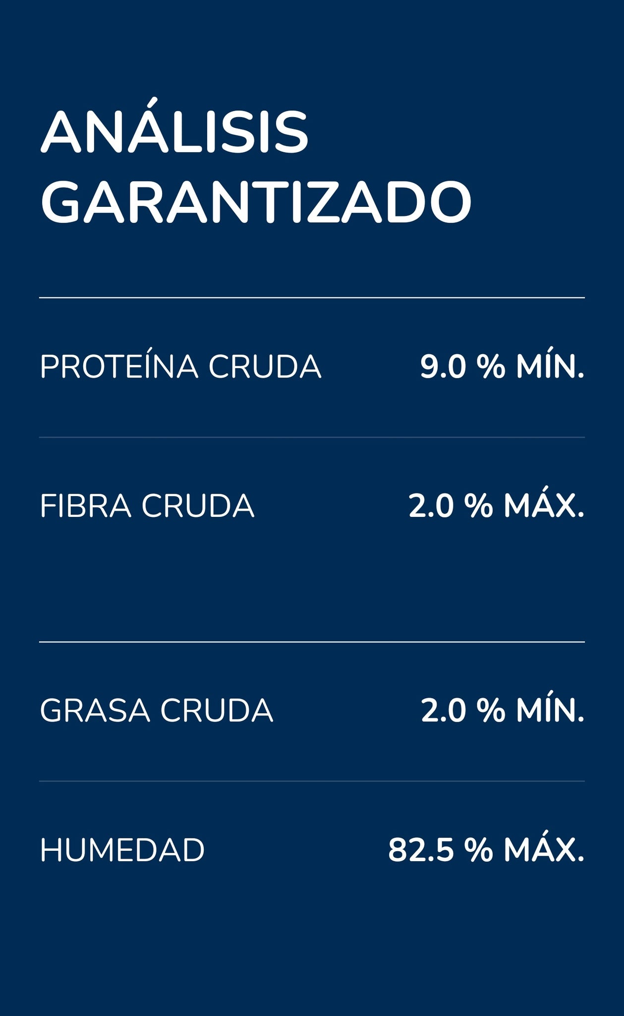 Agua suficiente para el proceso, carne y subproductos (carcasas y/o pasta y/o menudencias y/o hígado) de cerdo y ave (pollo y/o pavo) y pollo, derivados de origen vegetal, agente palatante, agentes gelificantes y/o espesantes, azúcares varios, taurina. Minerales: sulfato de cobre, manganeso, zinc, tripolifosfato de sodio, iodato de potasio, cloruro de sodio, cloruro de potasio. Vitaminas: suplementos de vitaminas E, tiamina (B1).