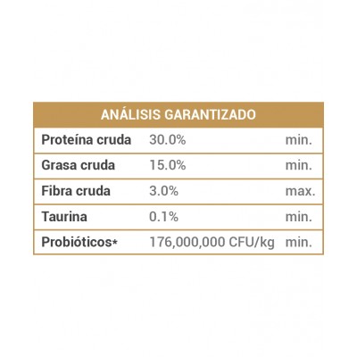 Harina de subproducto de pollo, granos enteros de maíz molidos, harina de trigo, grasa de pollo (preservada con mezcla de tocoferoles), harina de gluten de maíz, arroz blanco molido, pulpa de remolacha deshidratada, saborizante natural (pollo), linaza, harina de pescado, bisulfato de sodio, cloruro de potasio, cloruro de colina, DL-metionina, taurina, producto de fermentación de Lactobacillus plantarum secos, producto de fermentación de Bacillus subtilis secos, producto de fermentación de Lactobacillus Acidophilus secos, producto de fermentación de Enterococcus faecium secos, producto de fermentación de Bifidobacterium animalis secos, proteinato de zinc, suplemento de vitamina E, niacina, proteinato de manganeso, proteinato de cobre, sulfato de zinc, sulfato de manganeso, sulfato de cobre, mononitrato de tiamina, suplemento de vitamina A, biotina, yoduro de potasio, pantotenato de calcio, riboflavina, clorhidrato de piridoxina (vitamina B6), suplemento de vitamina B12, oxido de manganeso, selenito de sodio, suplemento de vitamina D, acido fólico.