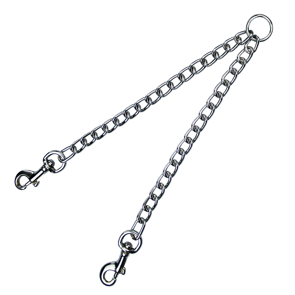 Enganche la argolla central de la extensión a una correa. Asegure el collar de las mascotas a cada extremo independiente para iniciar el paseo.
