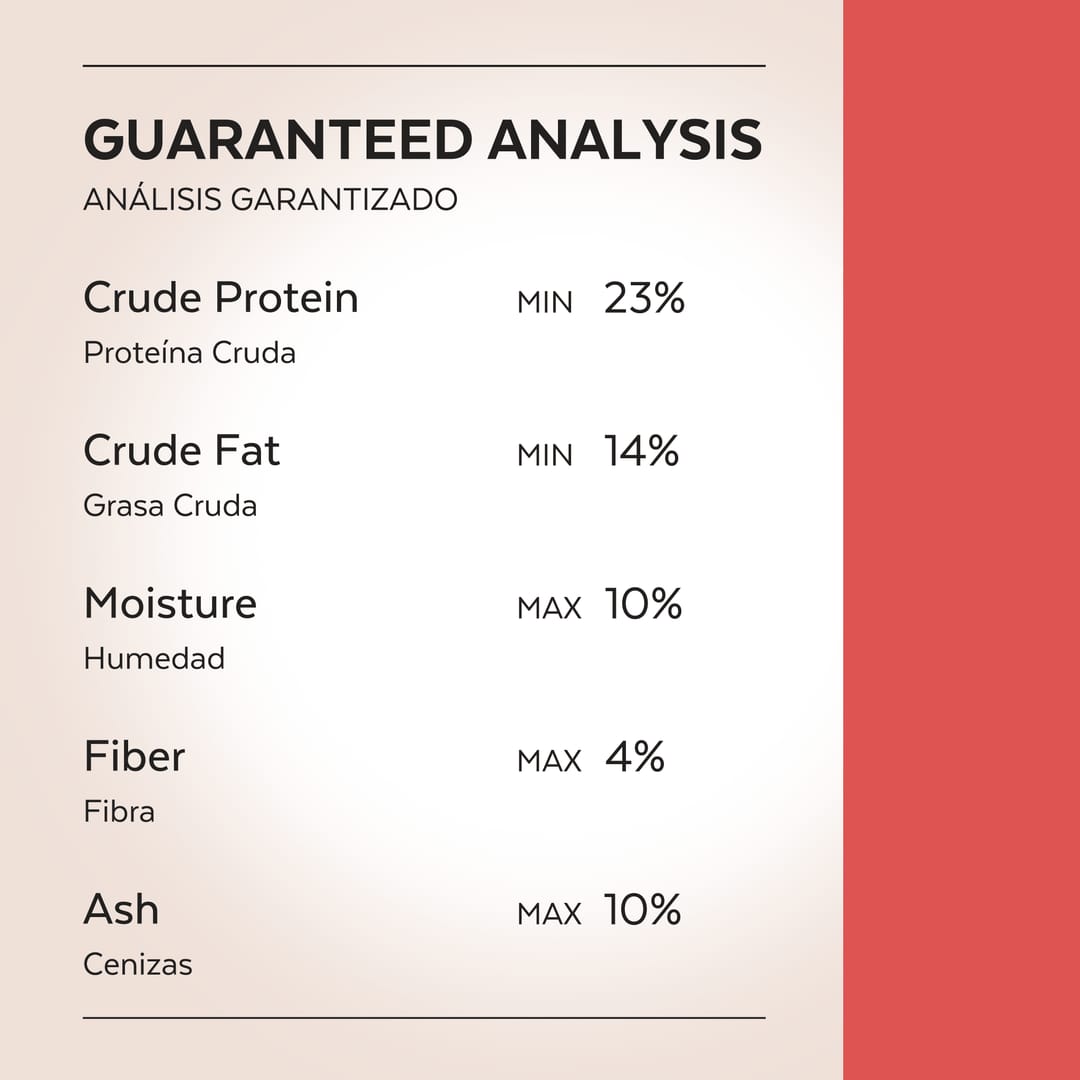 Harina de pavo, harina de arroz, pavo, harina de salmón, harina de pescado, grasa de cerdo (conservada con tocoferoles), tilapia, hidrolizado de cerdo, pulpa de remolacha, plasma porcino, alga marina Phaeophyta, cultivo de levaduras Saccharomyces Cerevisiae, sal, aluminosilicato de sodio, ácido cítrico, inulina de agave, extracto de Yucca schidigera, L-lisina, DL-metionina, producto seco de fermentación bacillus amyloliquefaciens, carbonato de cobalto, carbonato ferroso, fosfato cálcico, sulfato de cobre, selenito de sodio, óxido de magnesio, óxido de zinc, óxido de manganeso, alfa tocoferol acetato (vitamina E), niacina, vitamina A palmitato, suplemento de vitamina D3, suplemento de tiamina mononitrato, riboflavina, clorhidrato de piridoxina, suplemento de vitamina B12, suplemento de pantotenato de calcio, ácido fólico, complejo manganeso-glicina, complejo cobre-glicina, complejo hierro-glicina, complejo zinc-glicina, rojo 40.
