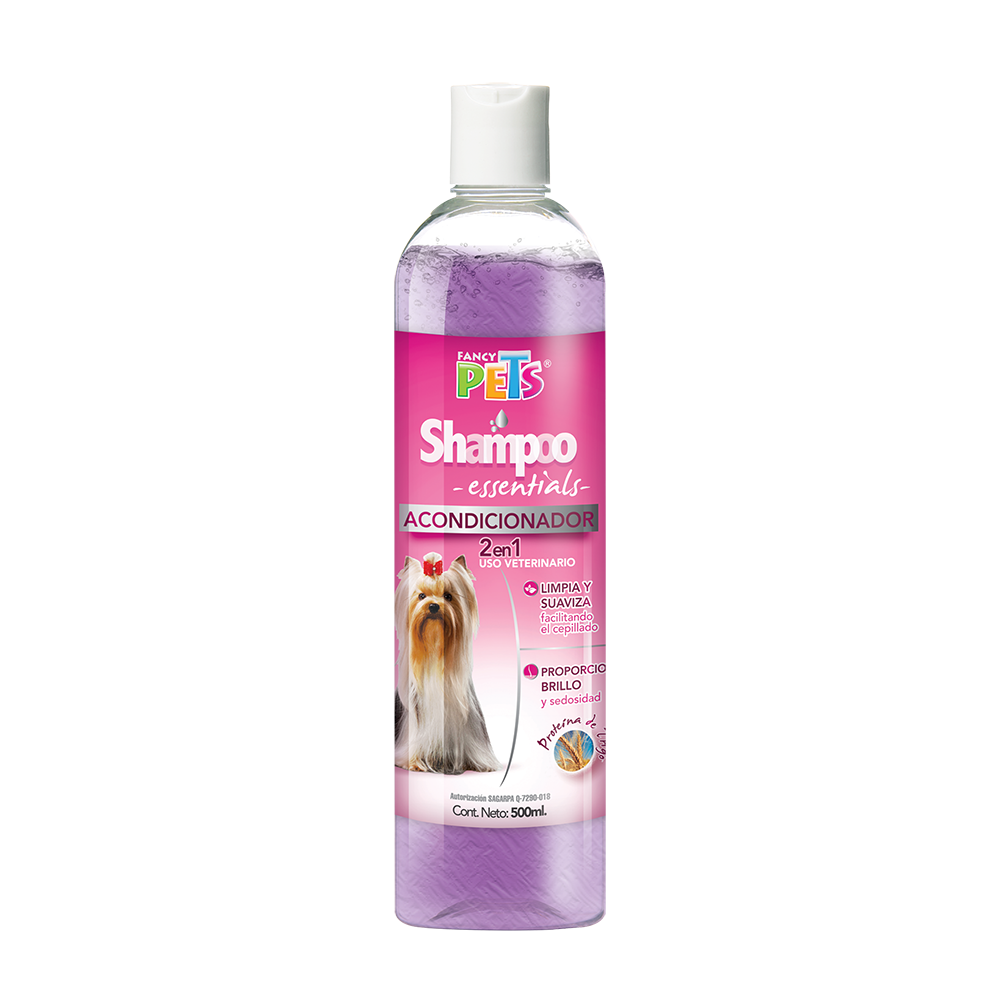 El Shampoo Essentials y Acondicionador 2 en 1 de Fancy Pets limpia y suaviza el pelo al mismo tiempo, proporcionándole brillo y sedosidad al tacto. No irrita la piel ni los ojos del perro.